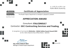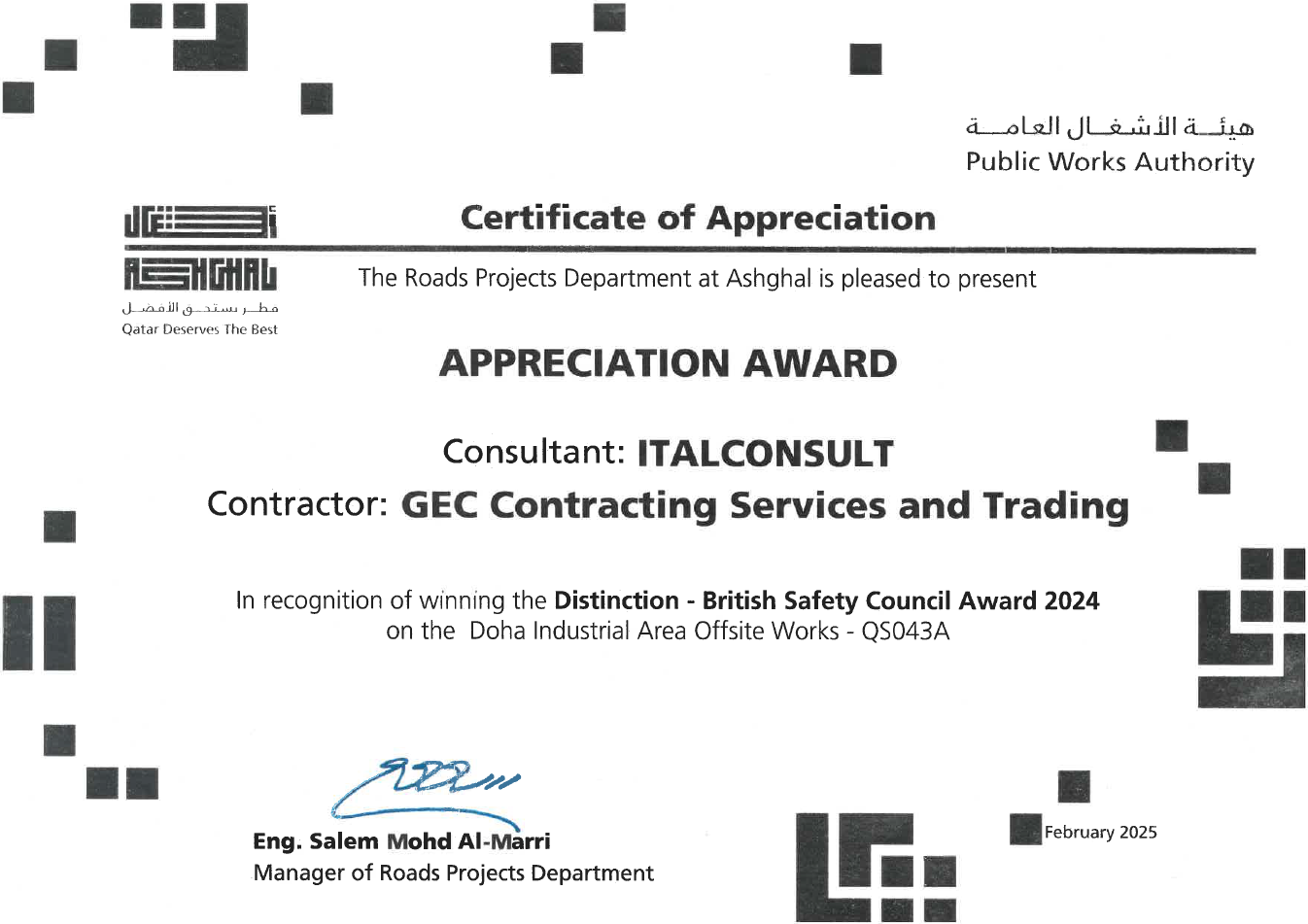 Italconsult is proud to have received an Appreciation Award from the Public Works Authority (PWA–Ashghal) for its role as Consultant in the Doha Industrial Area Offsite Works – Project QS043A. The recognition was granted by the Roads Projects Department in acknowledgment of the outstanding supervision and engineering services provided, which significantly exceeded expectations.